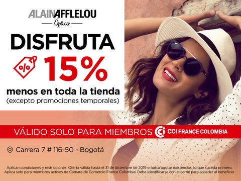 Alain Afflelou offre aux membres de la CCIFC une remise de 15% sur l’ensemble de la boutique (Carrera 7 # 116-50, Bogotá). Pour bénéficier de la promotion, vous devrez pouvoir justifier que vous travaillez dans l'une des entreprises affiliées à la CCIFC. Plus d'informations: ccifc@france-colombia.com