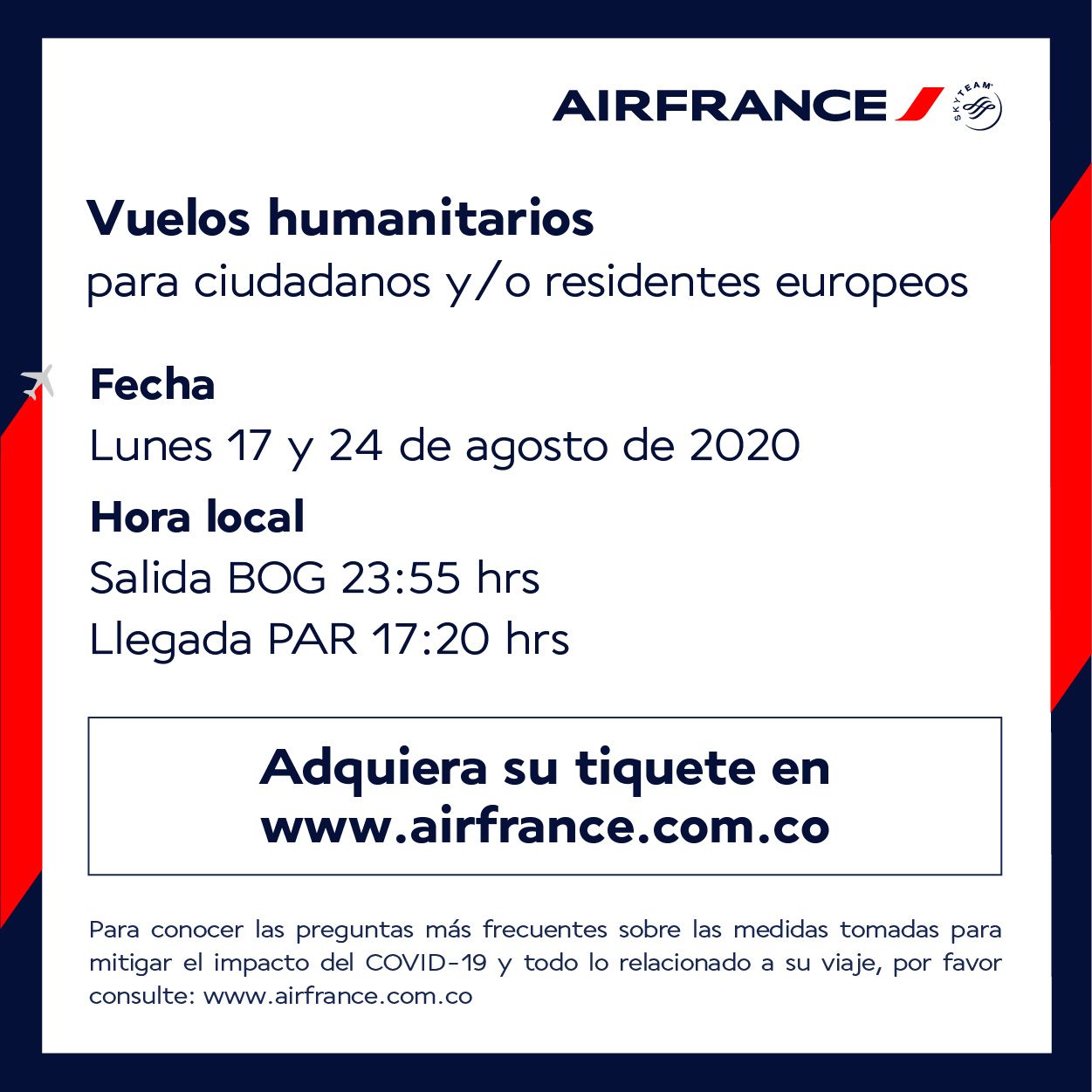 Actualités • Communication - Presse Air France - Mise à jour des vols humanitaires Le 05/08/2020 Site web pour l’achat de billets : https://wwws.airfrance.com.co/