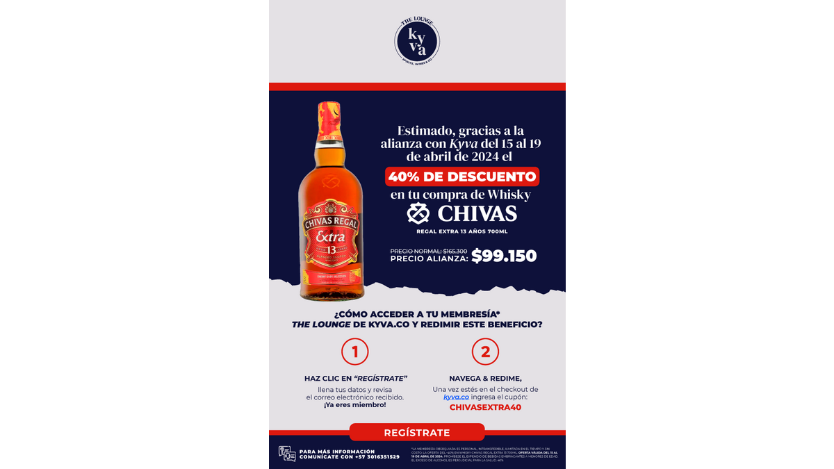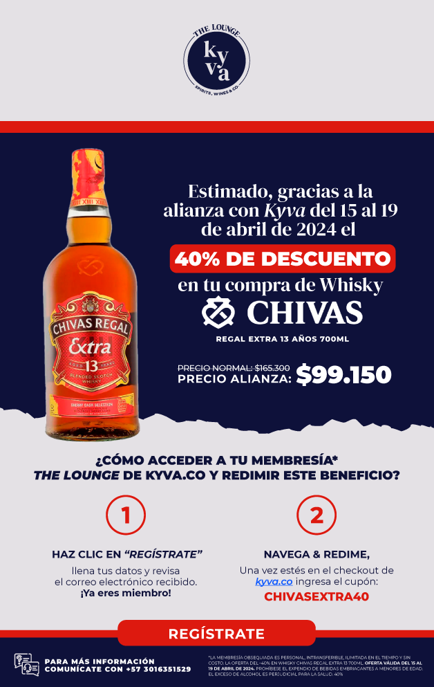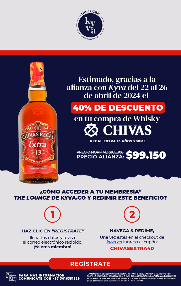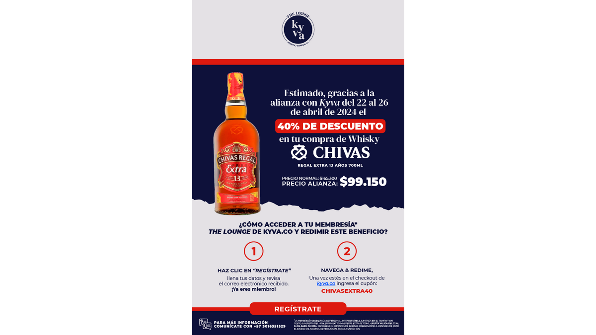 Notre affilié Kyva offre une remise de 40 % sur le whisky Chivas Regal Extra 13 ans, du 15 au 19 avril et du 22 au 26 avril.