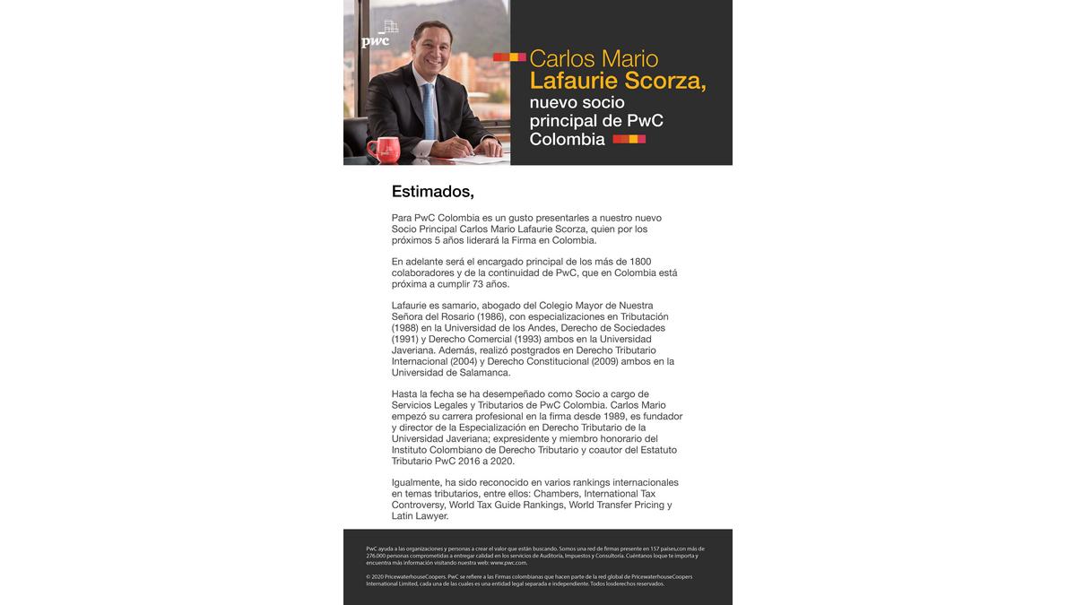 Actualités • Actus des entreprises Carlos Mario Lafaurie, nouveau partenaire leader pour PwC Le 08/07/2020