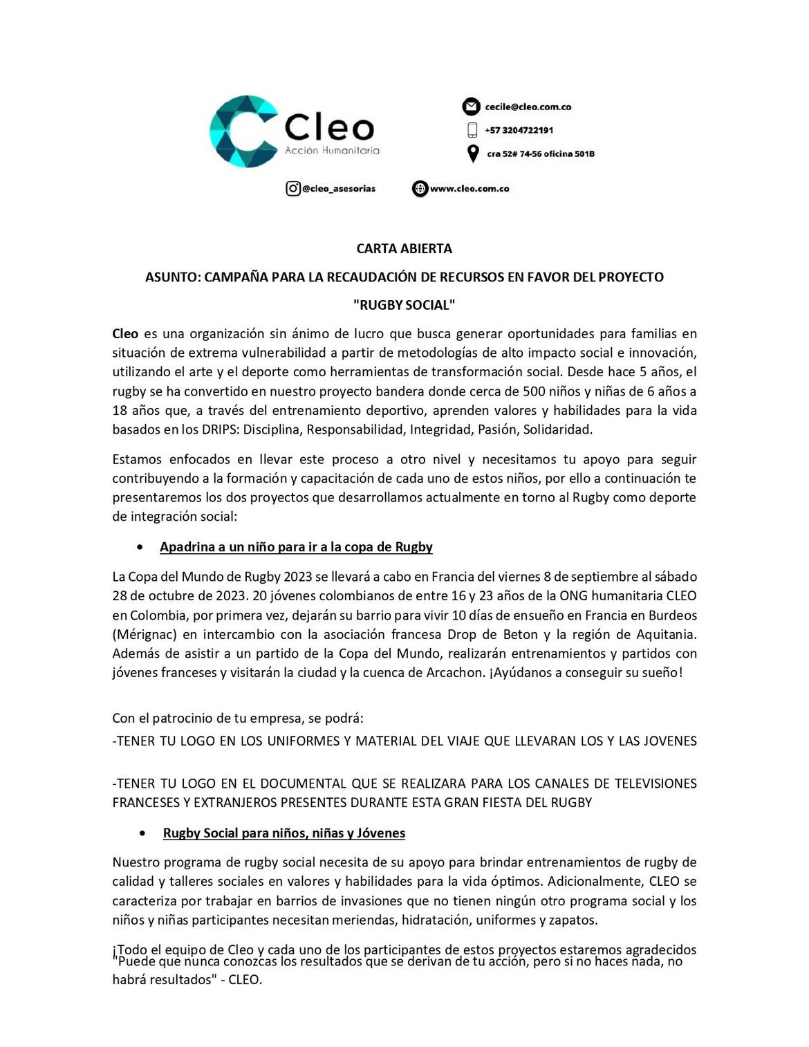 - Fournir aux enfants et aux jeunes de Barranquilla des entraînements de rugby, dans le cadre du projet "Social Rugby" ;