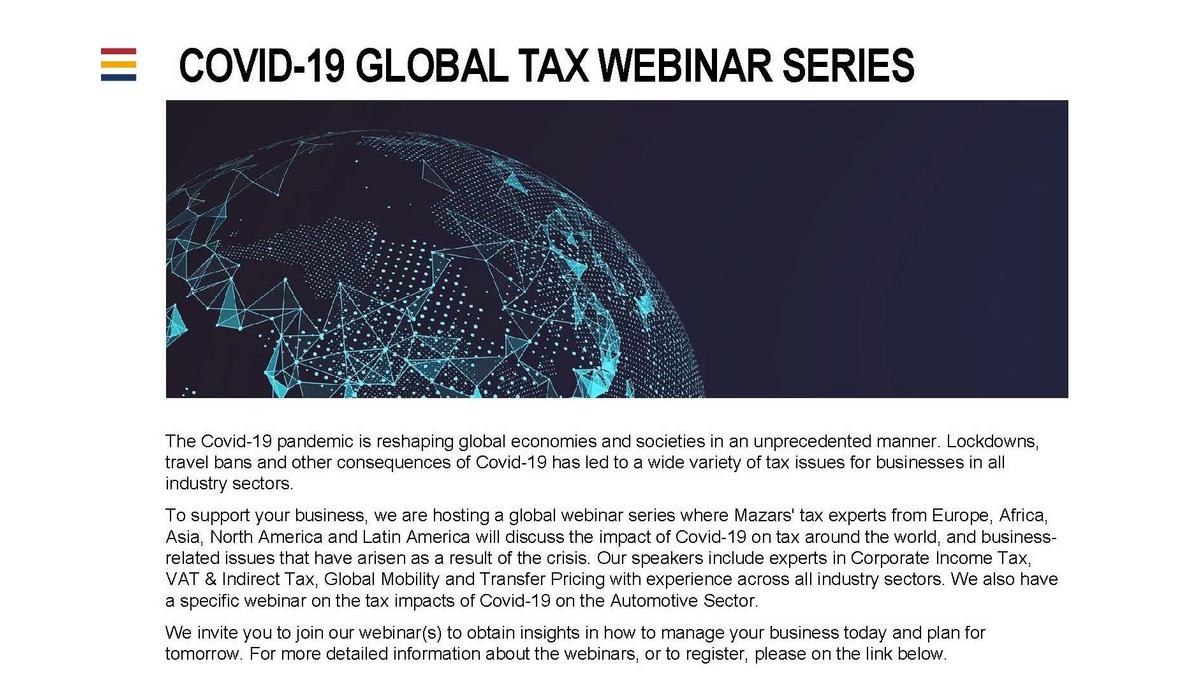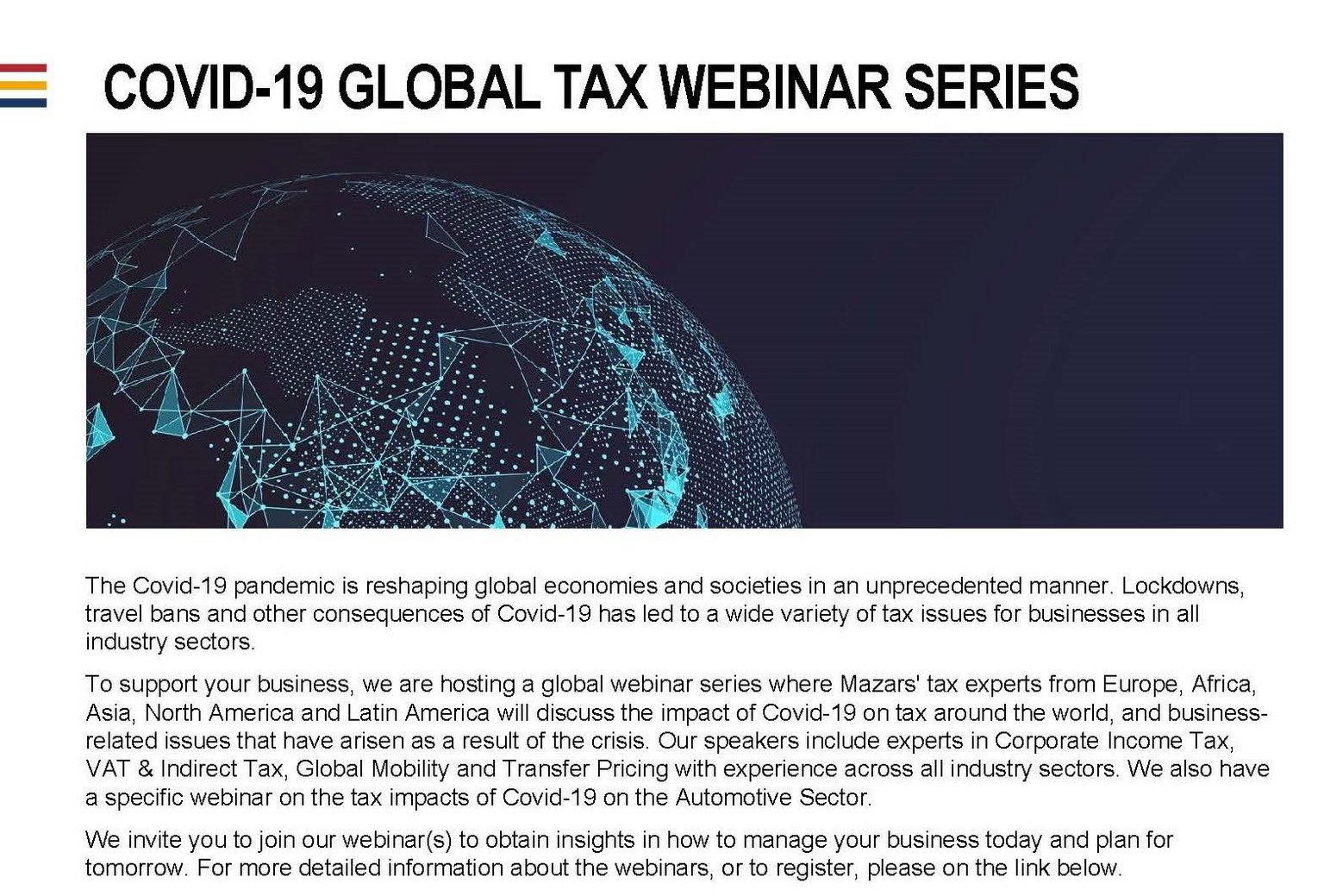 Mazars Global wants to share several Webinars with all its clients worldwide, that may be of your interest. We invite you to know the schedule and to register.