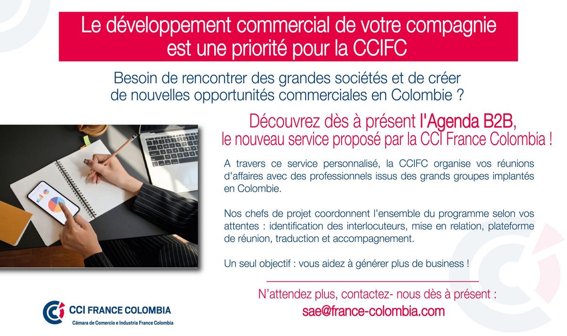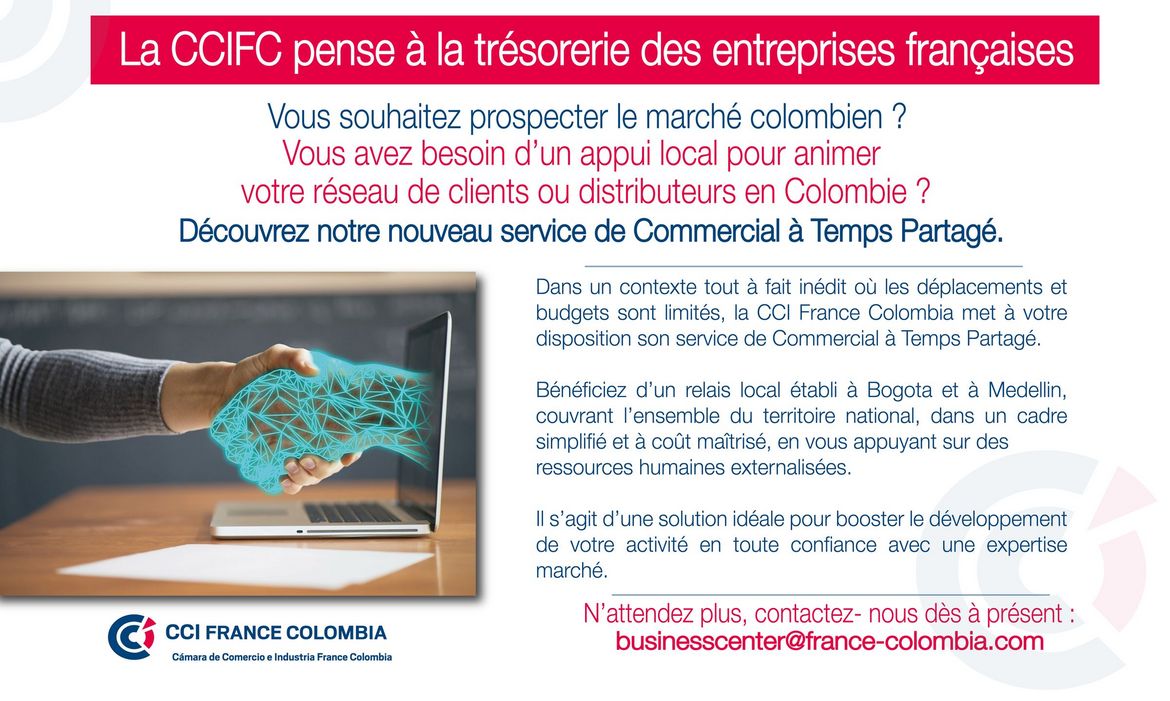 Découvrez les nouveaux services de la CCI France Colombia Le 08/09/2020 Agenda B2B et Commercial à temps partagé Si vous êtes intéressé par ce service, contactez-nous Si vous êtes intéressé par ce service, contactez-nous