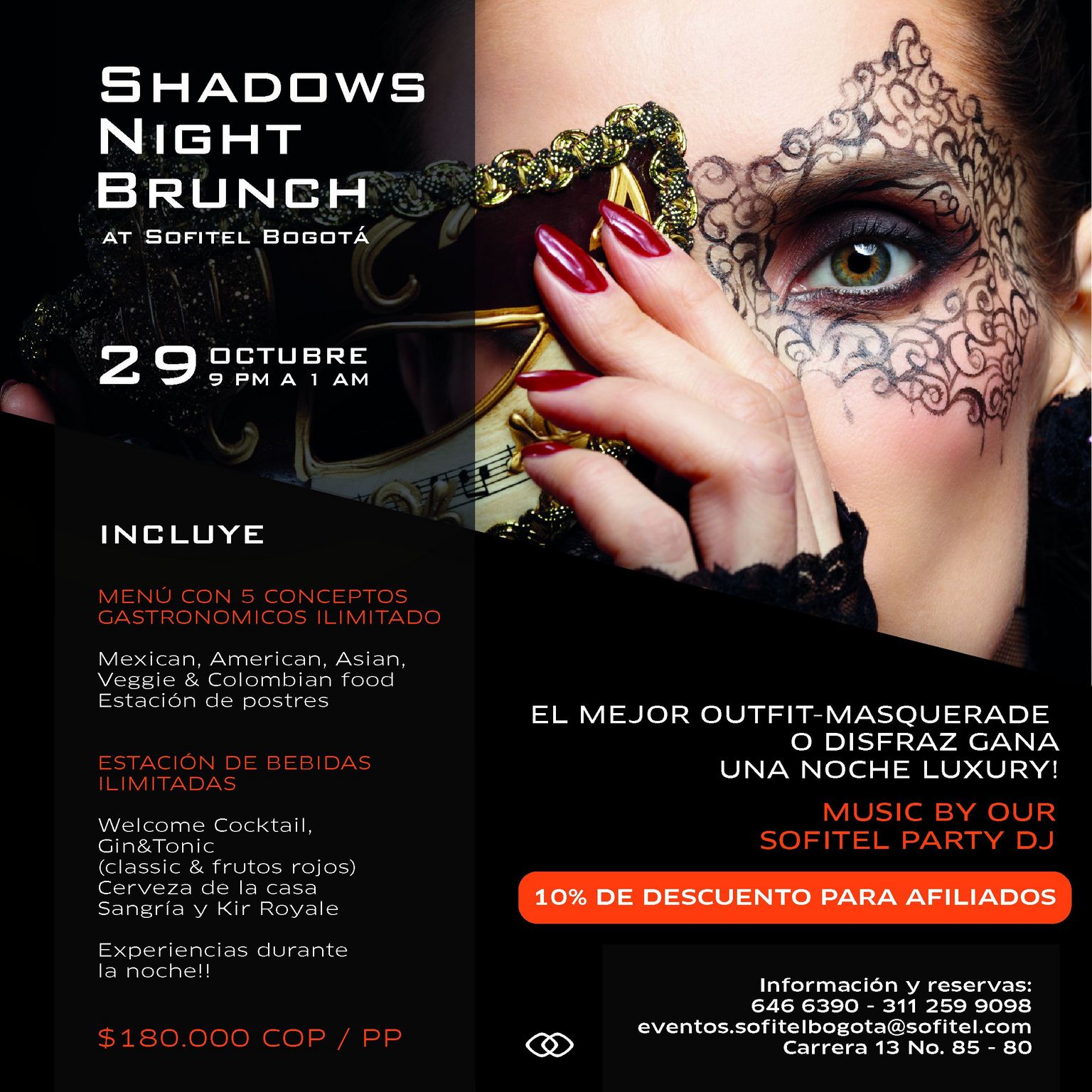 Découvrez l'offre spéciale Shadows Night Brunch du Sofitel Bogotá Victoria Regia Le 22/10/2021 Découvrez l'offre spéciale Halloween de notre affilié Sofitel Bogotá Victoria Regia qui aura lieu le 29 octobre !10% de réduction pour les affiliés