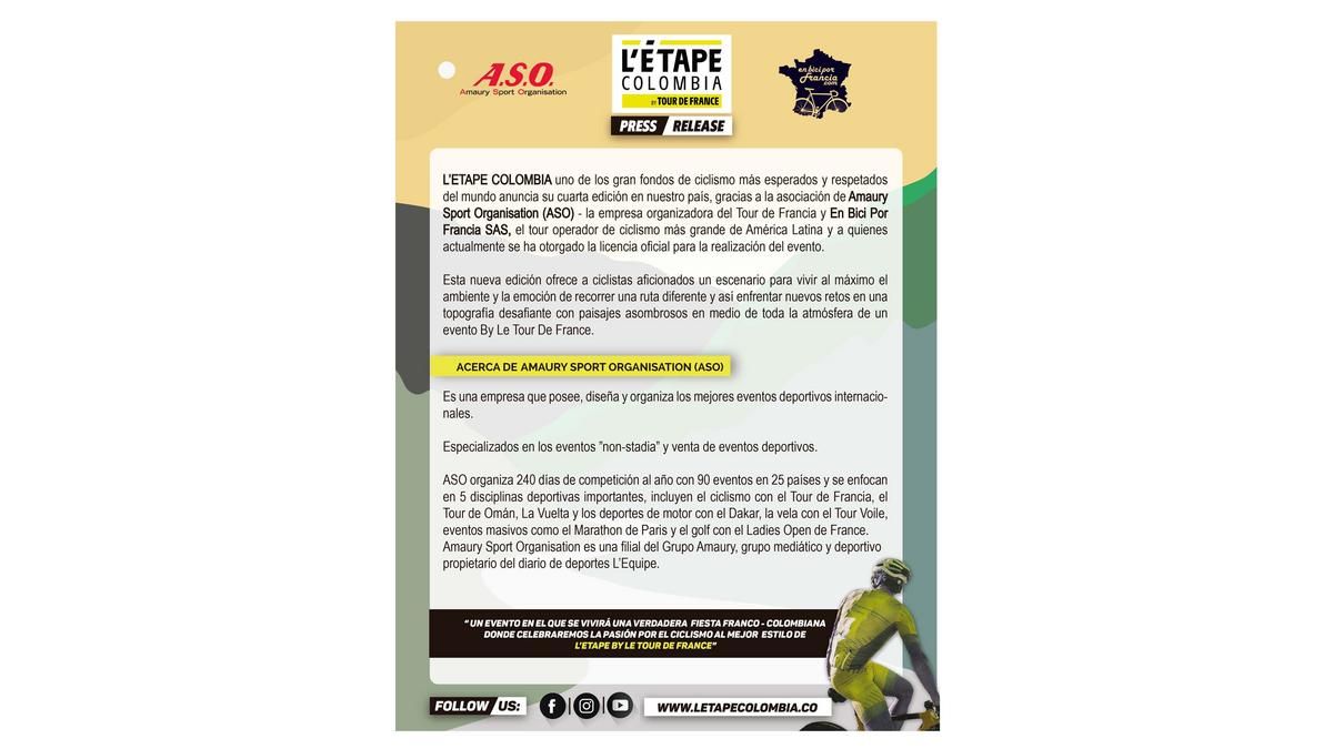 Actus des entreprises • Communication - Presse Descubra l’Etape Colombia by Tour de France Le 05/03/2021 Para participar en este evento y consultar mayor información, visite: www.letapecolombia.co Instagram Facebook