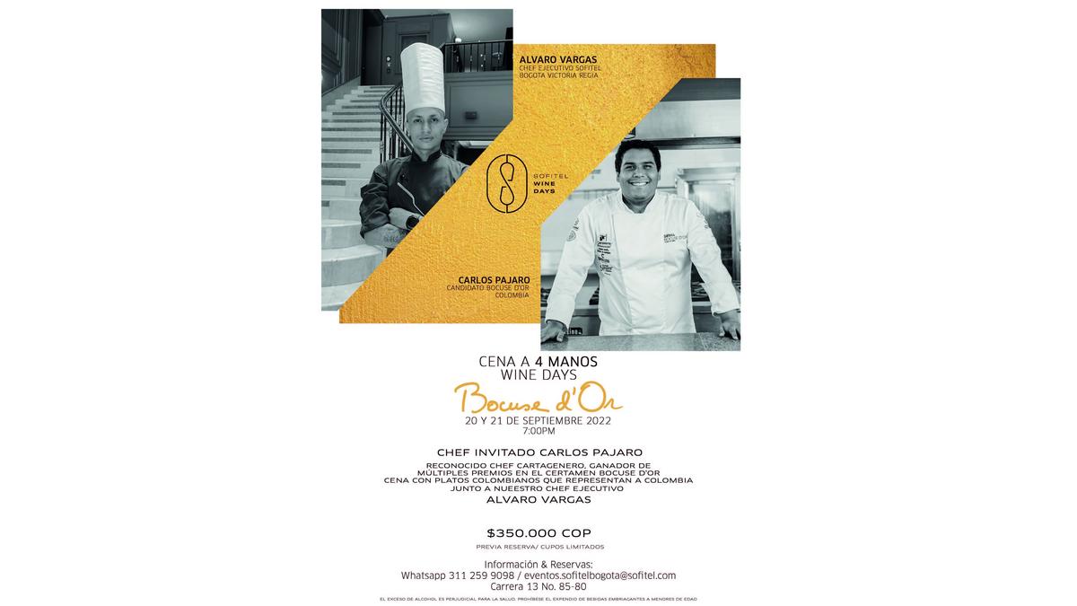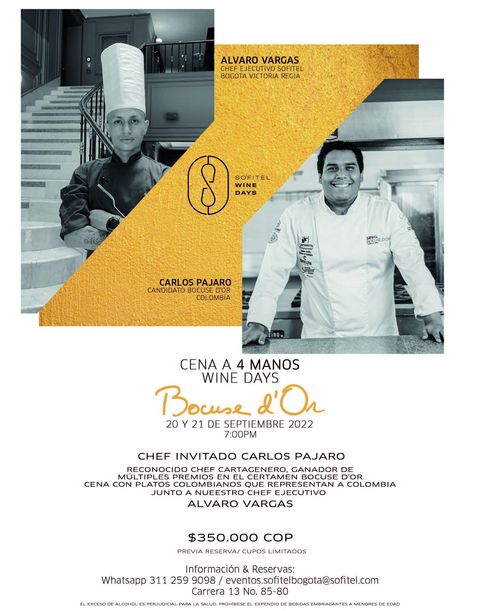 Les 20 et 21 septembre, Sofitel Bogota Victoria Regia organisera un dîner à 4 mains avec Carlos Pájaro et son chef exécutif Álvaro Vargas; le chef Carlos, est candidat au prix international de grande renommée : "Bocuse D’or"; pour cette raison, Sofitel souhaite inviter nos affiliés à cet événement spectaculaire, en leur accordant 15% de réduction sur les réservations effectuées.