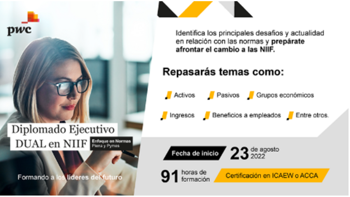 PwC Colombie est consciente de l’importance de l’enseignement supérieur pour le développement de professionnels aux normes élevées, qui sont mis à jour face aux nouvelles réglementations. C’est pourquoi ils veulent partager leurs expériences, leurs connaissances et leur expertise à travers le nouveau Diplôme Executive Dual en NIIF Plenas et PME, avec lequel vous pourrez obtenir une certification internationale en ICAEW ou ACCA.