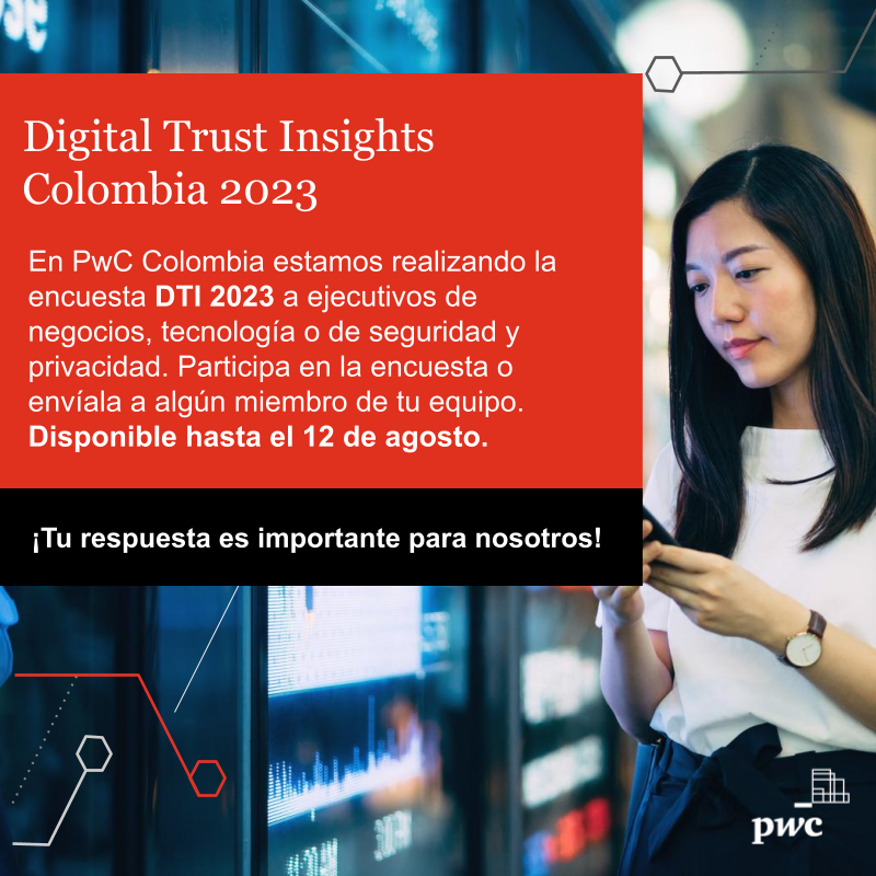 Êtes-vous un cadre en technologie, sécurité ou confidentialité? PwC Colombie vous invite à participer à son nouveau sondage DTI 2023. Faites partie des résultats du Digital Trust Insights Colombia 2023, pour aider cette entreprise, à connaître le paysage actuel des entreprises colombiennes en matière de cybersécurité et de confidentialité.