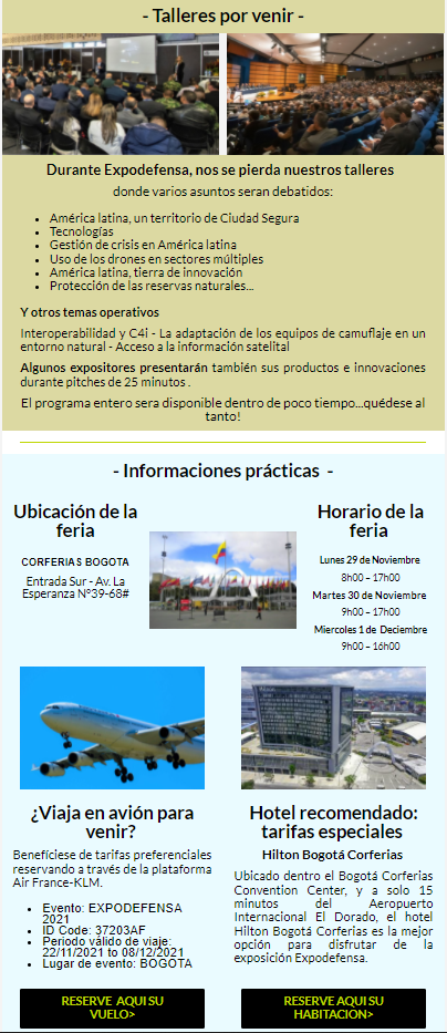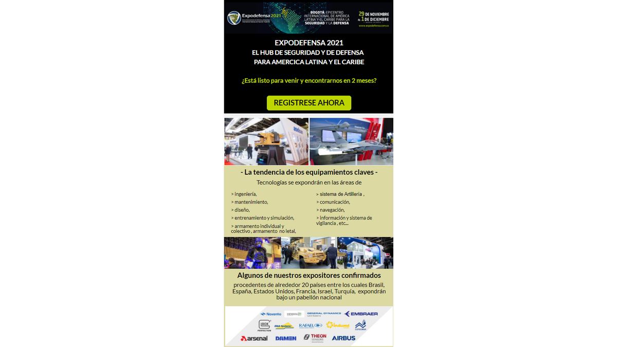 Expodefensa, le principal pôle pour la défense et la sécurité en Amérique latine et dans les Caraïbes Le 11/10/2021 Expodefensa est de retour en 2021 à Bogota du 29 novembre au 1er décembre DÉCOUVREZ-EN PLUS