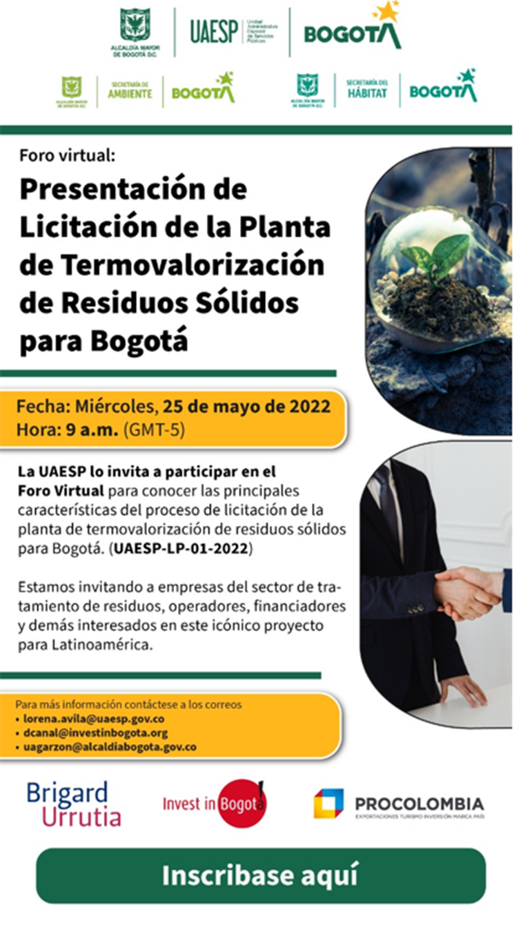 Webinar Forum virtuel : Présentation officielle de l'appel d'offres pour l'usine de récupération d'énergie thermique de Bogota. Le 25/05/2022 S'inscrire