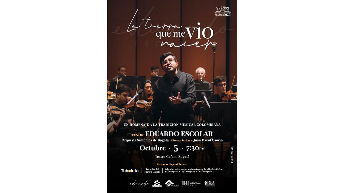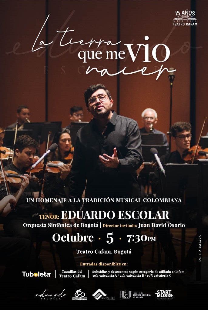 La Fundación Gero vous invite au concert "La tierra que me vio nacer" avec le ténor Eduardo Escolar, l'Orquesta Sinfónica de Bogotá et le chef d'orchestre invité Juan David Osorio. Il aura lieu le 5 octobre à 19h30 au théâtre Cafam, Av 68 # 90-88, Bogotá. Pour s'inscrire :