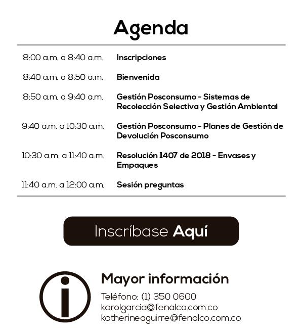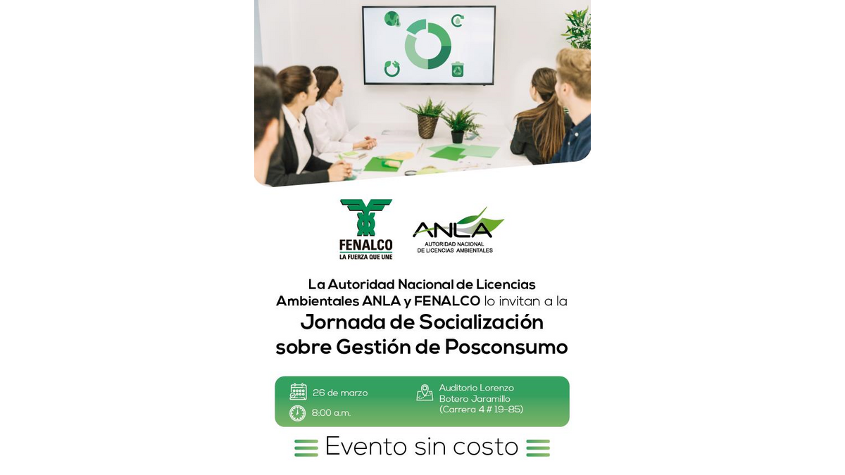 Firmen Neuigkeiten • Actualités • Actus des entreprises Journée de socialisation sur la gestion post-consommation avec ANLA Le 26/03/2019 Plus d’information :Téléphone : (1) 350 06 00Email : karolgarcia(@)fenalco.com.cokatherineaguirre(@)fenalco.com.co