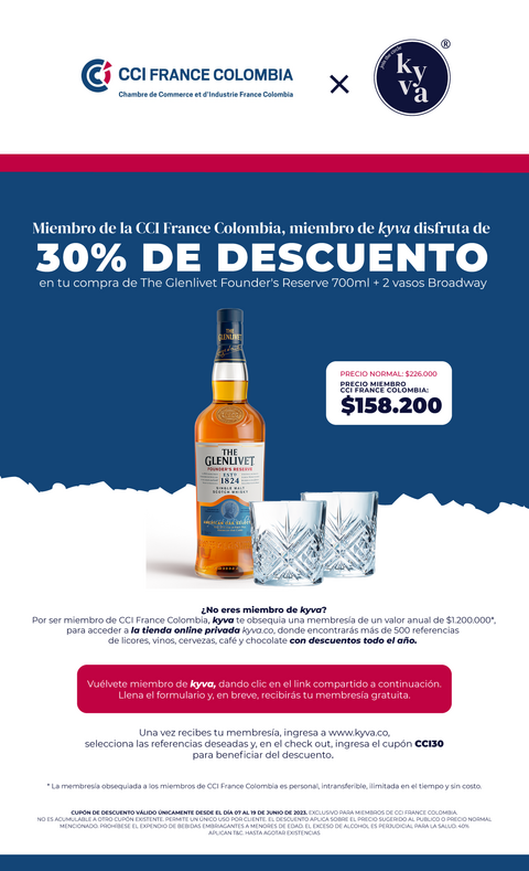 En étant membre de la CCI France Colombia, kyva vous offre une adhésion gratuite d'une valeur annuelle de $1.200.000* pour accéder à la boutique privée en lignekyva.co, où vous trouverez plus de 500 références de spiritueux, vins, bières, café et chocolat avec des réductions tout au long de l'année.