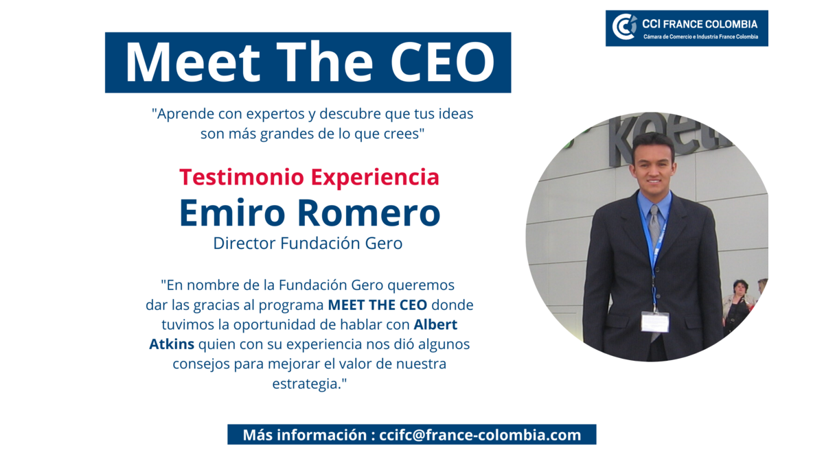 Au nom de la Fondation Gero, nous tenons à remercier le programme MEET THE CEO où nous avons eu l’opportunité d’échanger avec Albert Atkins qui, grâce à son expérience, nous a donné quelques conseils pour améliorer la stratégie de notre entreprise, en ouvrant de nouveaux canaux de communication par exemple. Je pense que cette réunion a été très productive et je recommande vivement cette activité. C'est une très bonne chose qu'une personne ayant une expérience dans un autre secteur vous montre une perspective différente. Merci beaucoup à la chambre de commerce et de l’industrie d'avoir permis cette réunion.
