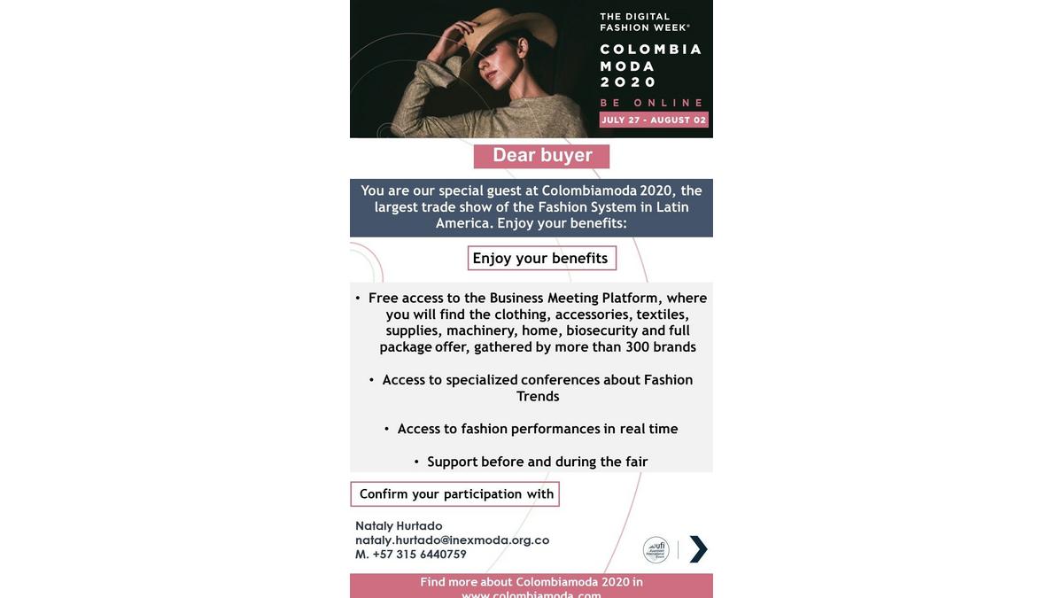 Actualités • Actus des entreprises La semaine de la mode numérique arrive Le 21/07/2020 Compradores Colombiamoda 2020 InternacionalLeer más publicaciones en Calaméo