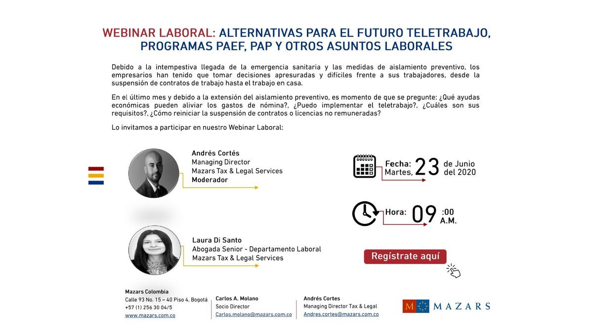 Mazars Colombia want share with its clients our new Labor Webinar in which we will talk about the economic aid programs to ease the expenses of payroll (PAEF and PAP), as well as the recommendations and application of telework, work at home and the resumption of suspended contracts.