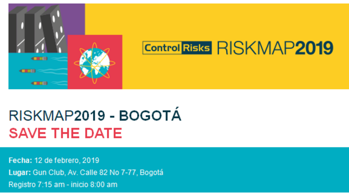 Accompagnez-nous le mardi 12 février dans le lancement de RiskMap 2019, pronostic annuel de risques pour les affaires. Control Risk vous invite à un petit déjeuner/conférence où un groupe d'experts vous présentera un panorama sur les plus grands défis et les opportunités actuels pour faire des affaires en Colombie et dans la région.