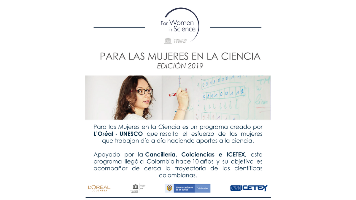 Bogotá, D.C. junio de 2019. Llega una nueva edición en Colombia del programa Para las Mujeres en la Ciencia, iniciativa mundial del grupo L’Oréal en alianza con la UNESCO, que destaca el esfuerzo y dedicación de las mujeres científicas colombianas que con su trabajo aportan significativamente a todos los campos de la investigación científica.