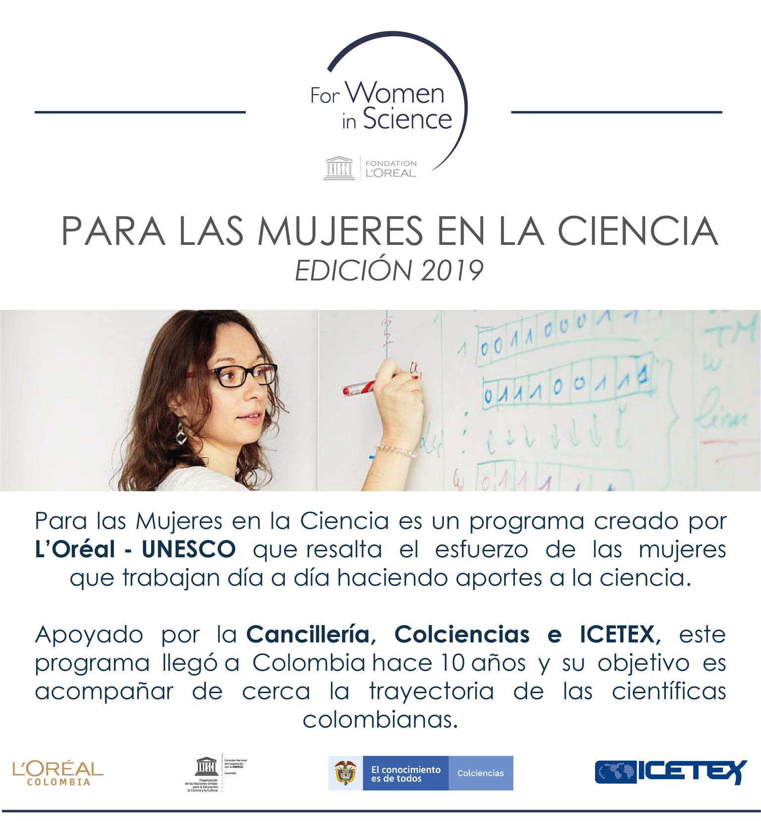 L’Oréal y la UNESCO establecieron en 1998 el programa L’Oréal - Unesco ‘For Women in Science’ con el objetivo de promover el papel de la mujer en la ciencia en todo el mundo. Desde entonces, el programa ha sido lanzado a escala mundial, con el apoyo de las Comisiones Nacionales de la UNESCO, las autoridades científicas locales y el público a quien se dirige. Este programa está constituido por la entrega de 15 becas internacionales de investigación -3 por continente- que otorga el Programa ‘Para las Mujeres en la Ciencia L'Oréal-UNESCO’. También cuenta con un premio para cinco mujeres científicas consagradas -una por continente- en el ámbito de Ciencias de la Vida o Ciencias de la Materia, alternando cada año. El programa nacional de becas “Para las Mujeres en la Ciencia” L'Oréal - Unesco se inició en Colombia en el 2009.