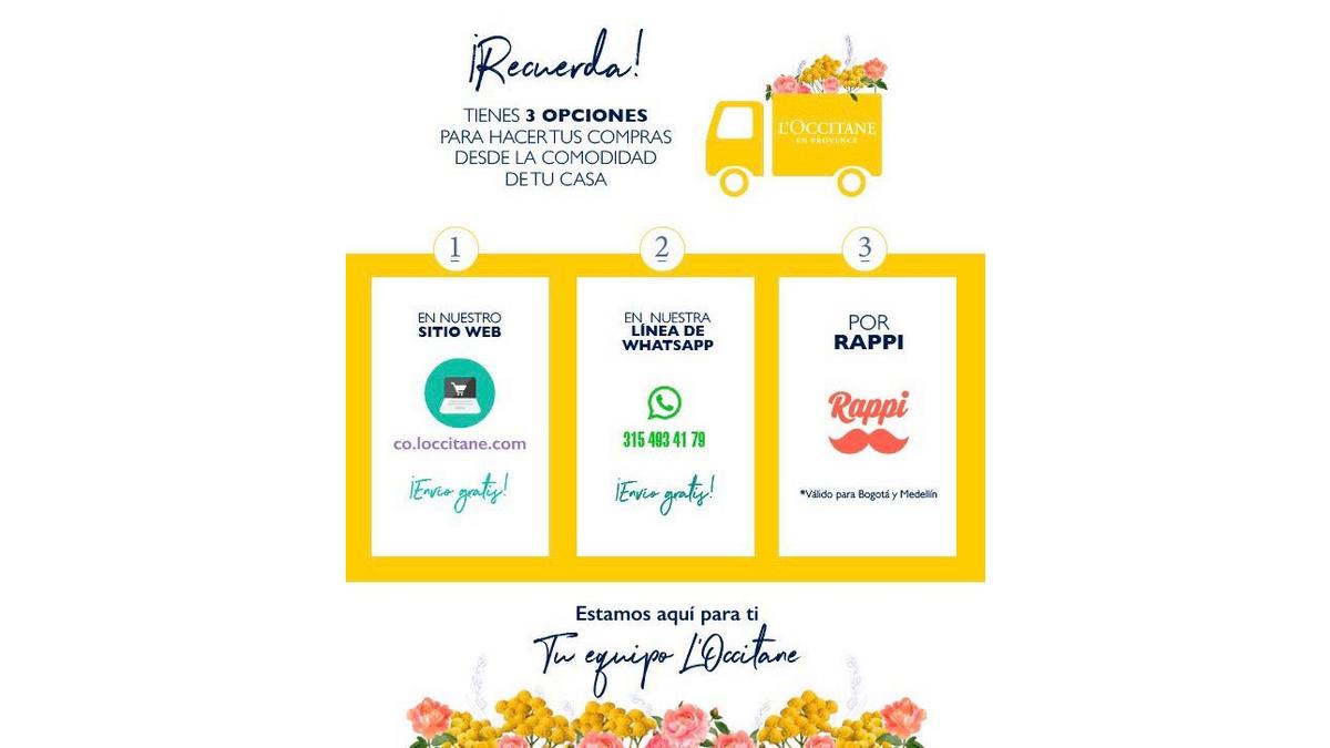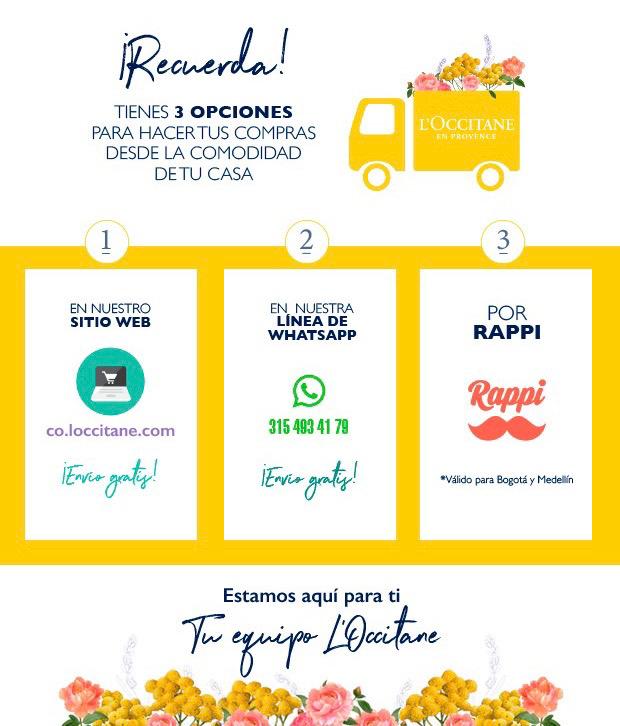En cette période de crise du COVID-19, chez l’Occitane, nous savons qu’il est plus que jamais important de prendre soin de soi et de ses proches. C’est pour cela que nous restons à vos côtés durant cette période, en respectant nos engagements de protection de la planète et d’une production en faveur de l’environnement. Nous avons engagé des efforts afin de vous apporter du contenu de valeur à partager en famille : tutoriels sur le lavage de mains, cours de cuisine, de yoga… Nous allons également renforcer nos canaux de vente en ligne afin de vous apporter le meilleur suivi et des solutions de livraisons à domicile, principalement à Bogota et Medellin. C’est grâce à ces moyens que nous pouvons continuer la commercialisation de nos produits tels que les savons l’Occitane, qui lavent en profondeur et protègent la peau grâce à des formules naturelles non agressives. L’Occitane est une marque engagée pour le bien-être de ses clients et c’est pour cela que nous allons lancer un catalogue digital afin de conserver ce lien avec notre marque.