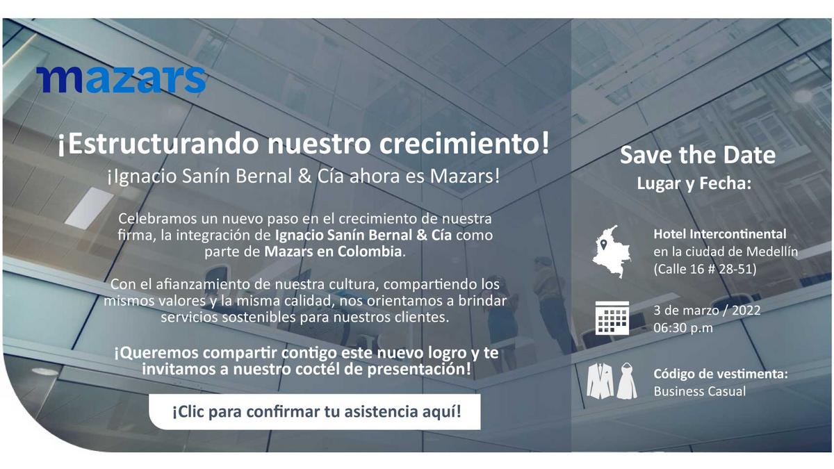 Actus des entreprises Mazars vous invite à son cocktail de lancement à Medellin Le 11/02/2022 Veuillez confirmer votre participation:sur ce lien