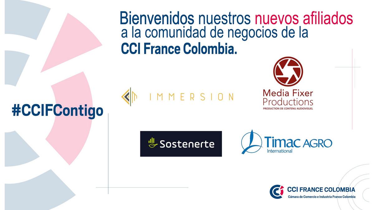 Nous souhaitons la bienvenue aux nouveaux membres de la CCI France Colombie Le 28/01/2021 IMMERSION - Sustainable Estate Secteur d'activité : Hôtellerie ; Voyages, Tourisme Secteur d'activité :Média Sostenerte Secteur d'activité :Services de conseil aux entreprises. TIMAC AGRO INTERNATIONAL Secteur d'activité :Services de conseil aux entreprises.