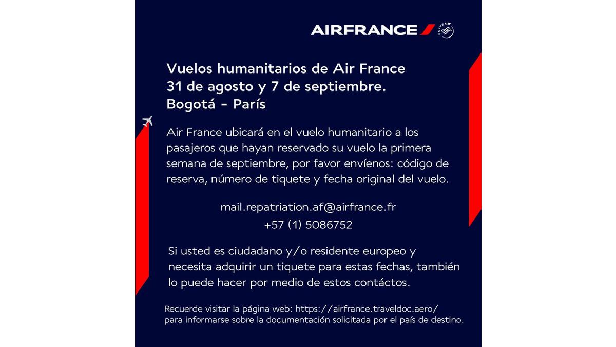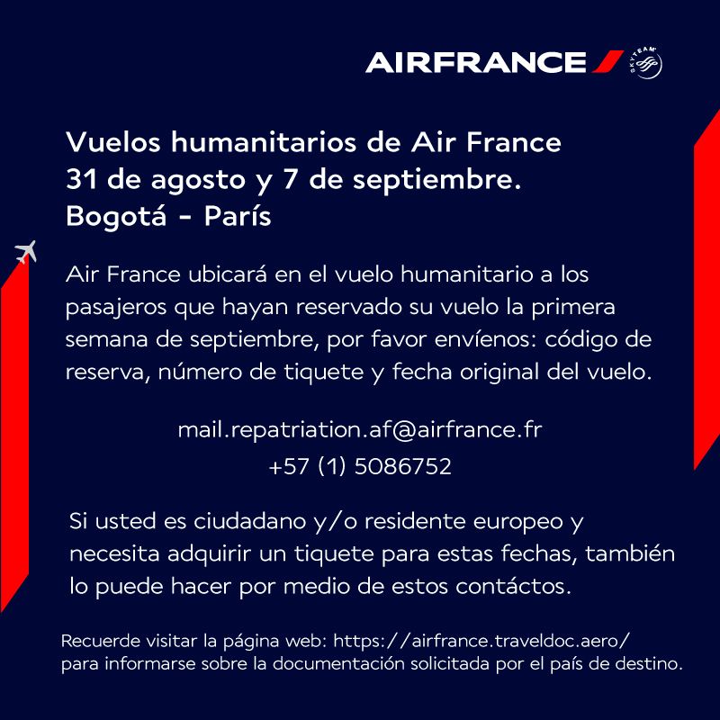 Si vous avez réservé un billet dans un de nos vols commerciaux d’Air France prévus pour la première semaine de Septembre, merci de nous envoyer votre code de réservation, numéro de billet et date initiale du voyage à l’adresse suivante: mail.repatriation.af(@)airfrance.fr ou d’appeler le numéro +57 1 5086752 à fin de reprogrammer votre vol pour les prochaines dates de rapatriement prévus le 31 Août et le 07 Septembre 2020. Si les dates ne s’ajustent pas à vos besoins, des nouvelles dates pour le mois de Septembre seront annoncés dans les jours qui suivent.