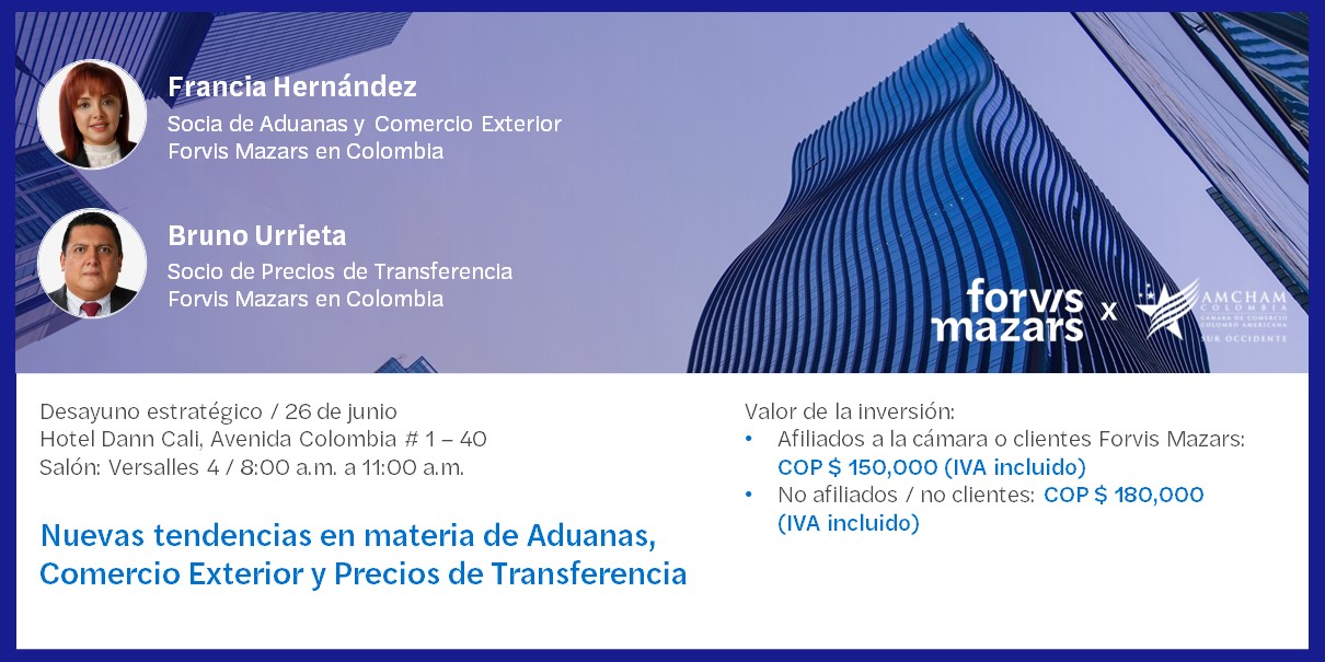 Cet événement sera animé par FRANCIA INES HERNANDEZ DIAZ, Associée Douanes et Commerce Extérieur de Forvis Mazars en Colombie et Bruno Urrieta Farías, Associé Prix de Transfert de Forvis Mazars en Colombie.