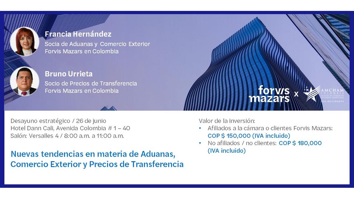Cet événement sera animé par FRANCIA INES HERNANDEZ DIAZ, Associée Douanes et Commerce Extérieur de Forvis Mazars en Colombie et Bruno Urrieta Farías, Associé Prix de Transfert de Forvis Mazars en Colombie.