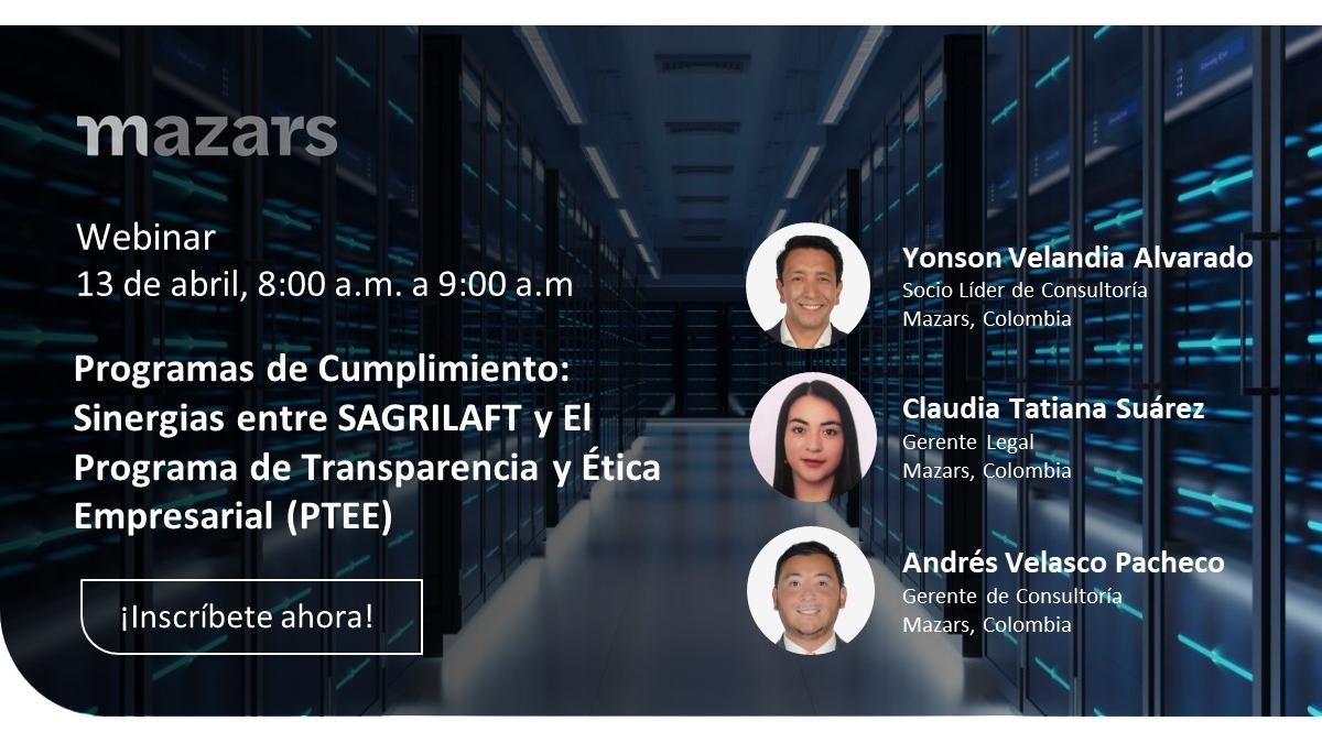 Le 13 avril prochain, sera abordé le thème des "Programmes de conformité : Synergies entre SAGRILAFT et le Programme pour la transparence et l'éthique des affaires (PTEE)". Ce webinaire sera animé par Yonson Velandia, la représentante légale Claudia Tatiana Suárez et le Consulting Manager Andrés Velasco.