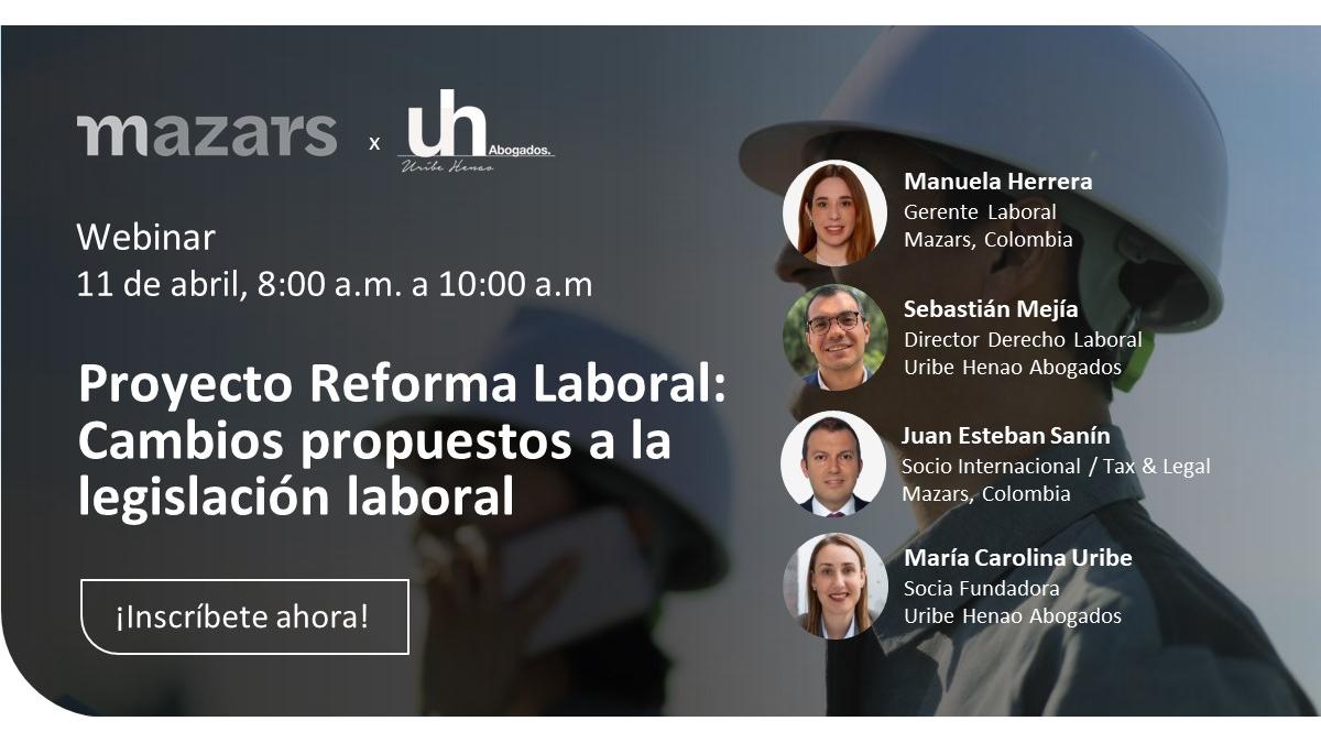 Le 11 avril prochain, sera abordé le thème “Projet de Réforme Laborale: Propositions d'amendements à la législation laborale” avec UH&C Abogados et AmCham Antioquia & Caldas - Cámara de Comercio Colombo Americana. Ce webinaire sera animé par le Partenaire International de Tax & Legal, Juan Esteban Sanín et María Carolina Uribe, fondatrice de Uribe Henao Abogados. Cet évènement sera également dirigé par la Labor Manager Manuela Herrera et Sebastián Mejía, directeur du département du Droit du travail de Uribe Henao Abogados.
