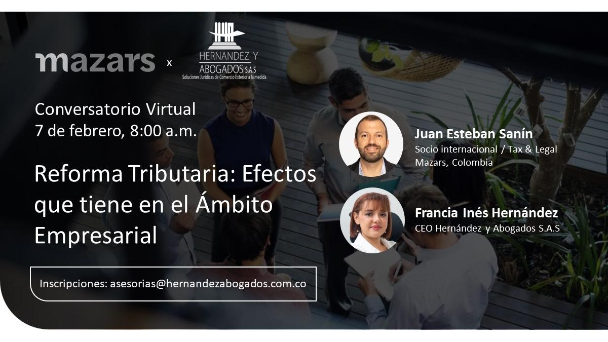 Nous vous invitons à la conférence virtuelle de notre allié Mazars en Colombie, ce 7 février avec Hernandez et avocats où ils aborderont La Réforme fiscale : Effets dans le domaine des affaires. Cet événement sera dirigé par le Partenaire International / Tax & Legal Juan Esteban Sanín de Mazars en Colombie et le PDG France Inés Hernández Diaz de Hernández y Abogados.