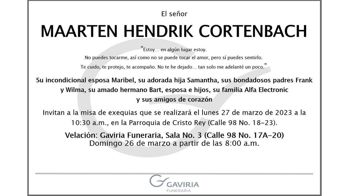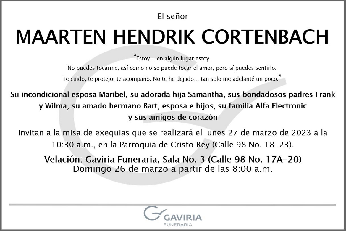 Nous avons le regret de vous informer du décès de l'ingénieur Maarten Cortenbach, directeur général d'Alfa Electronic SAS (anciennement affilié à la CCI France Colombia), survenu la semaine dernière à la suite d'un arrêt cardiaque.
