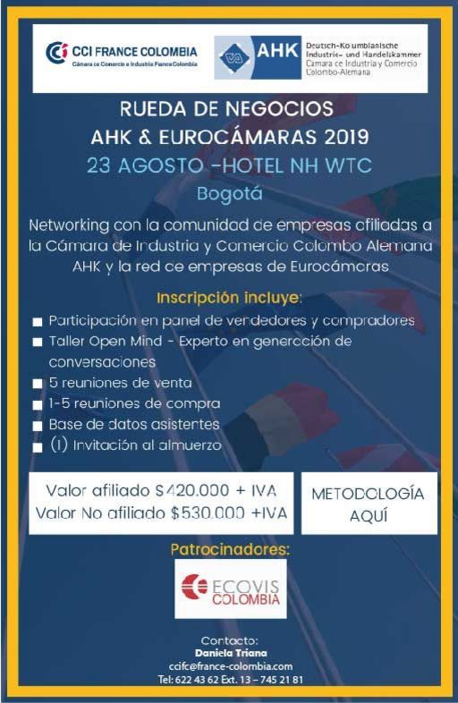 Networking avec la communauté d’entreprises membres de la Chambre de Commerce et d'Industrie Colombo-Allemande AHK et le réseau d'entreprises d'Eurochambres, le 23 août – hotel NH WTC, à Bogota.