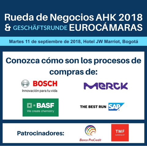 La Rueda de Negocios AHK 2018 – Geschäftsrunde & EUROCÁMARAS, se llevará a cabo el 11 septiembre de 2018 en Bogotá en el Hotel JW MARRIOT.