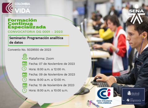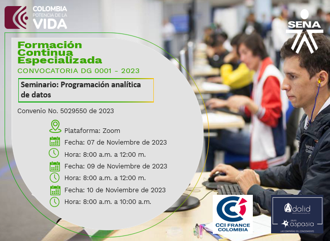 El Programa de Formación Continua Especializada del SENA, CÁMARA DE COMERCIO E INDUSTRIA FRANCE COLOMBIA - CCI FRANCE COLOMBIA. Adalid Inmark, Entidad capacitadora. A través de la Transferencia de Conocimiento y Tecnología, tenemos el gusto de invitarlo(a) a participar en el Seminario "Programación analítica de datos”, que se llevará a cabo los días 07 de noviembre (8:00am a 12pm) , 09 de noviembre (8:00am a 12pm) y 10 noviembre de 8:00 a.m. a 10:00 a.m.