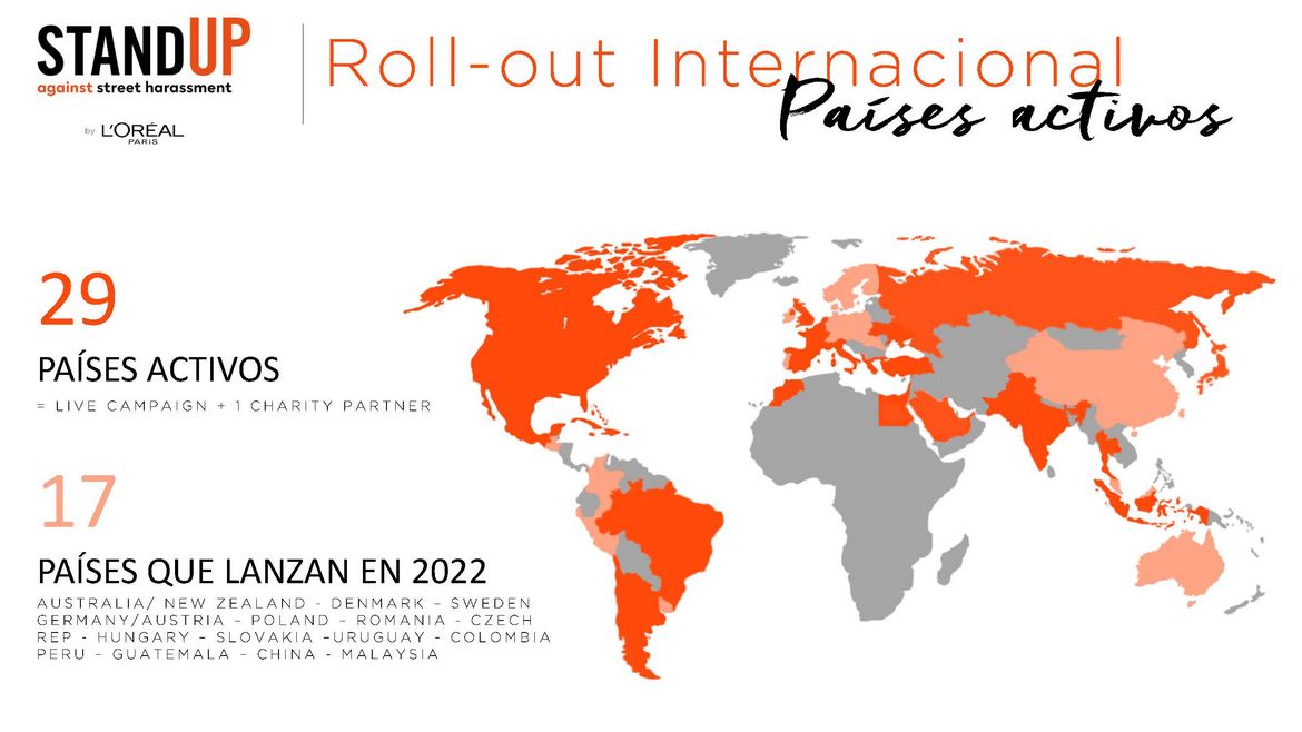 Ya activado en Francia, España, Argentina, Canadá, Estados Unidos, México, Italia e India con socios de caridad locales, Stand Up Against Street Harassment se ha lanzado recientemente en 8 nuevos países (Reino Unido, Alemania, Países Bajos, Grecia, Ucrania, Israel, Turquía, Indonesia) y 1 región (el Caribe). En asociación con la ONG local Ayuda en Acción, otros países lanzaron el programa el presente año (2022): Colombia, Chile, Perú, Centro América, Pakistán, Egipto, Tailandia, Marruecos, Líbano, Suiza, Polonia, Rusia, Suecia, Dinamarca, Finlandia, Noruega, Bélgica, Brasil, Australia, Japón, Emiratos Árabes Unidos y Arabia Saudita.