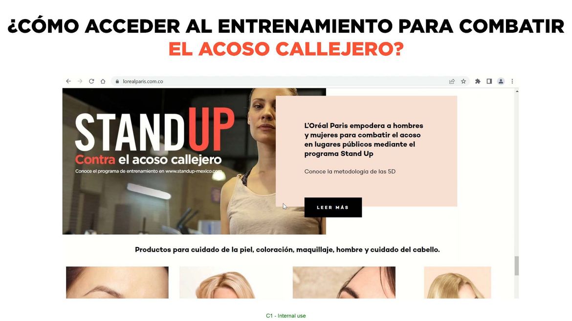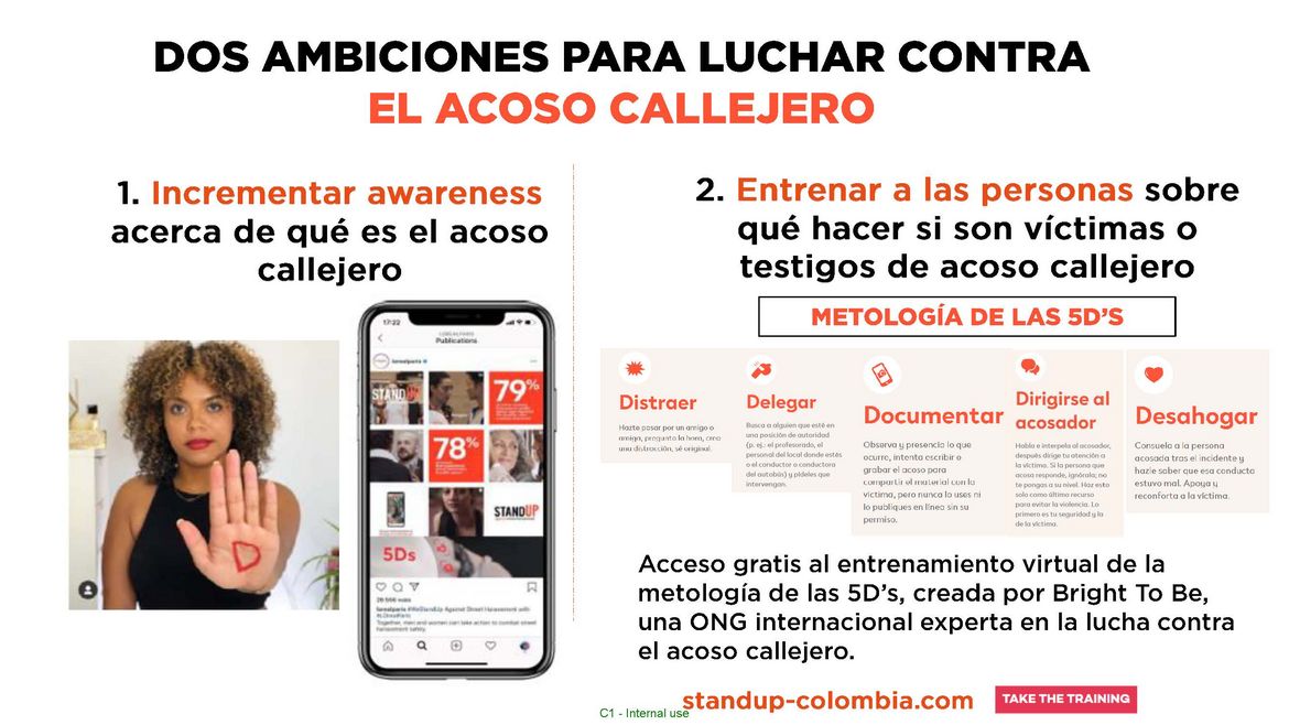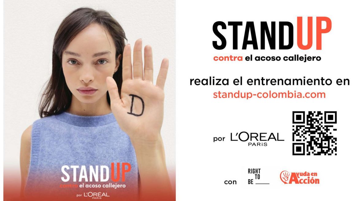 L'Oréal Paris anima al público a unirse al movimiento Stand Up capacitándose en la metodología de las 5D en standup-colombia.com y luego compartir su experiencia en las redes sociales, con un signo de mano de 5D y el hashtag #WeStandUp #DFrenteAlAcosoCallejero.