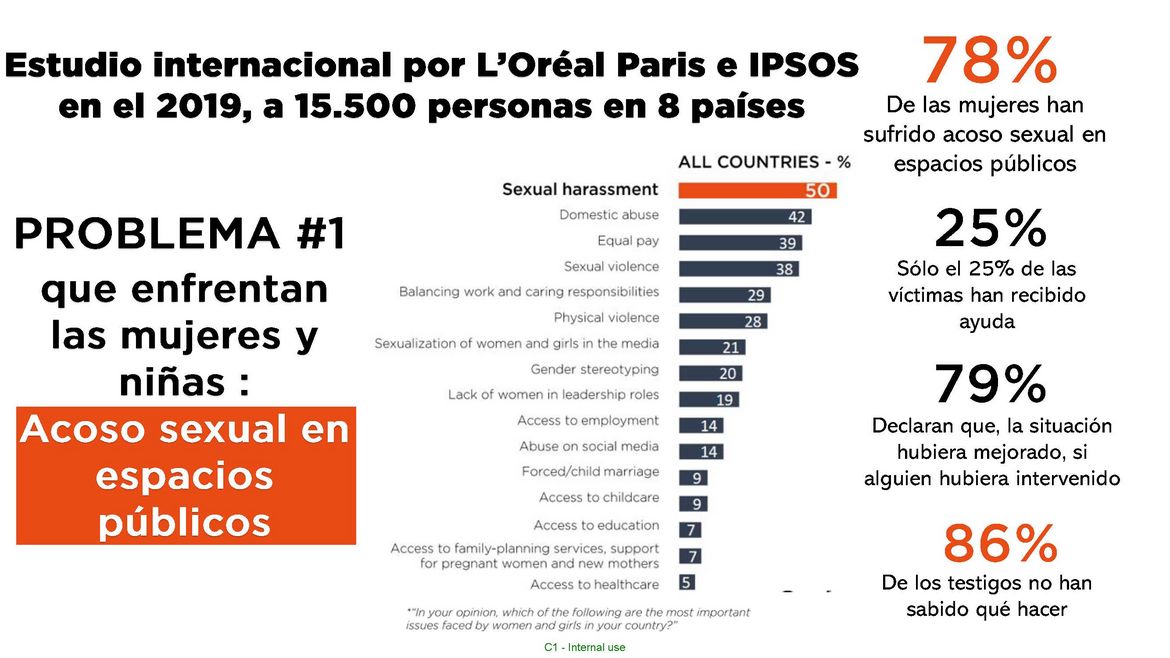 Encuesta internacional sobre acoso sexual en espacios públicos", realizada por L'Oréal Paris con Ipsos, con datos recopilados en 8 países con más de 15.000 participantes, abril de 2019. |