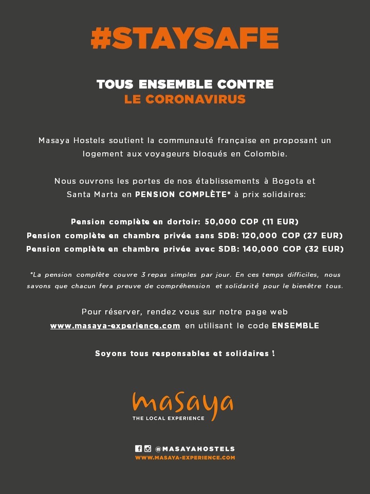 #StaySafe - Tous ensemble contre le COVID19 avec Masaya Le 24/03/2020 Durant cette période de confinement, Masaya Hotels ouvre ses portes aux français bloqués en Colombie, en proposant des prix solidaires.