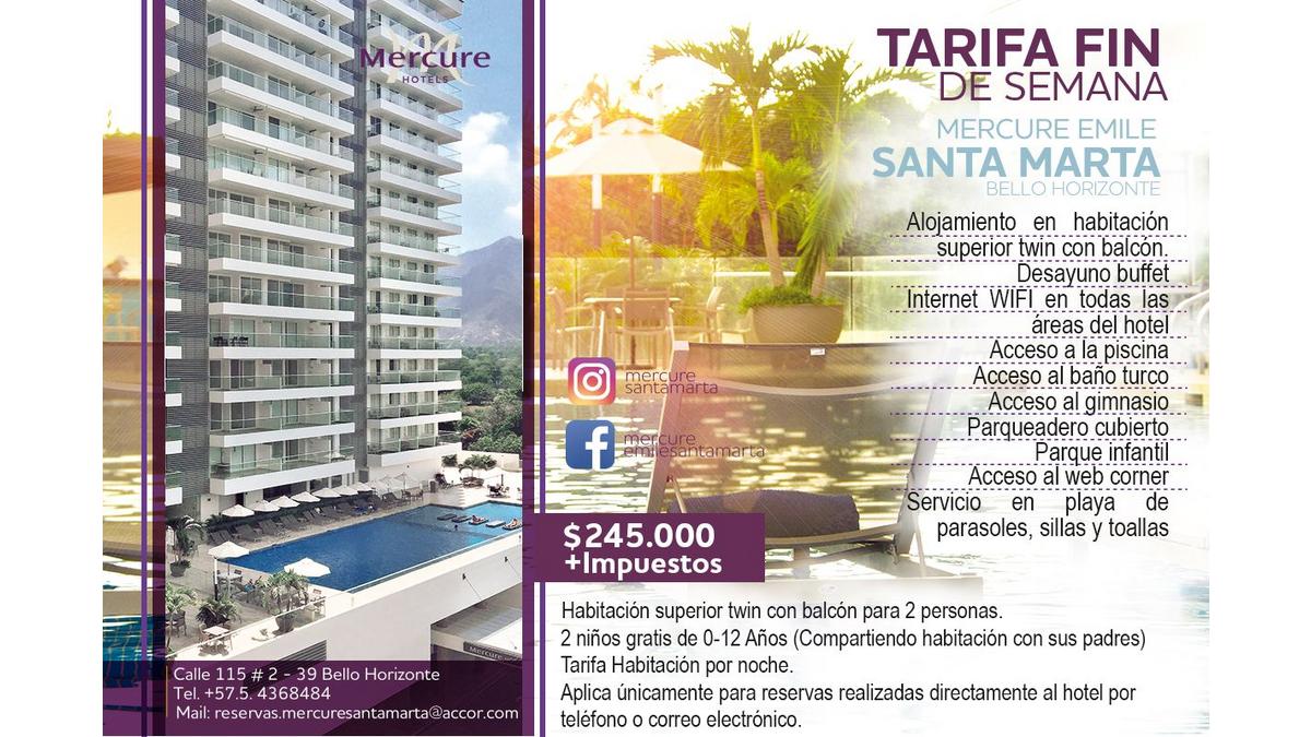Nuestros Afiliados tienen tarifas preferenciales los fines de semana en Mercure Emile en Santa Marta Bello Horizonte. Para mayor información contactarse con Maria Paula Bernal maria-Paula.bernal(@)accor.com