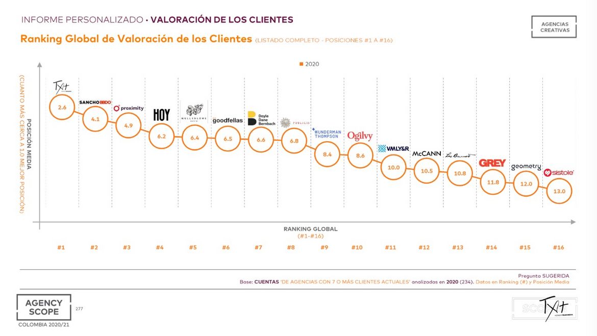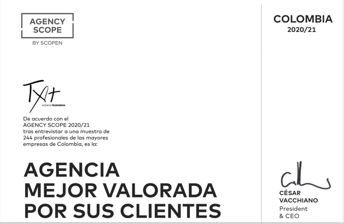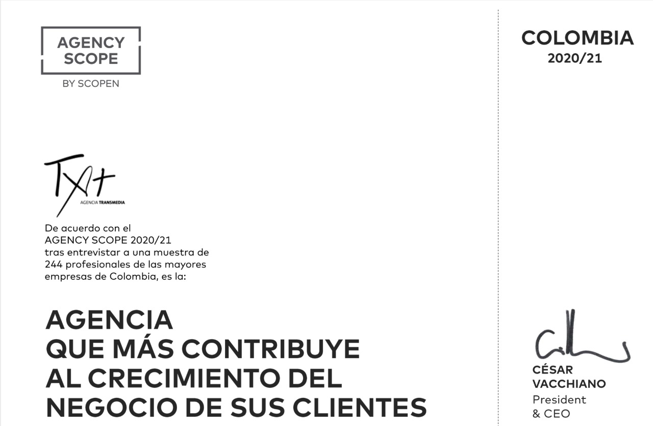 Après avoir interrogé un échantillon de 244 professionnels de grandes entreprises du pays, l'étude Agency Scope a décerné deux reconnaissances globales à TXT Agence Transmedia, comme : L’Agence qui contribue le plus à la croissance de l’activité de ses clients et comme l’Agence la mieux notée par ses clients. Il a également fourni 30 résultats partiels supplémentaires, parmi lesquels l'agence a été qualifiée d'innovante et créative.