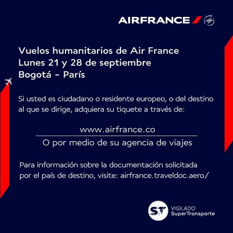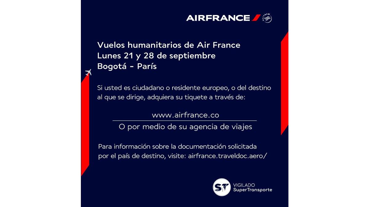 Si vous êtes intéressé par le vol humanitaire Bogota - Paris du 14 septembre, contacter l'équipe commerciale d'Air France sur : mail.repatriation.af(@)airfrance.fr
