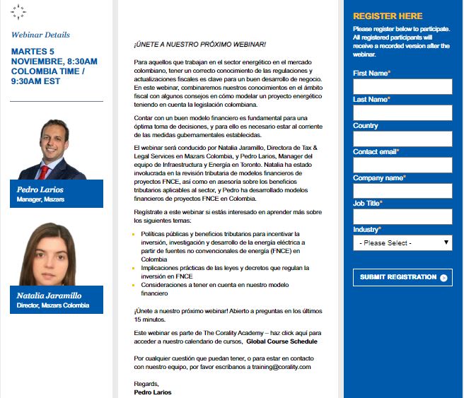 Webinar Considérations relatives à la modélisation financière des impôts dans le secteur des énergies renouvelables en Colombie