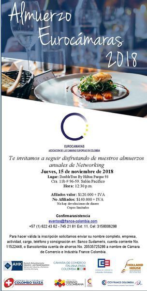 Para hacer válida la inscripción solicitamos enviar su nombre completo, empresa, actividad, cargo, teléfono y consignación en: Banco Sudameris, cuenta corriente No. 11522448, o Bancolombia cuenta de ahorros No. 20535725286 a nombre de Cámara de Comercio e Industria France Colombia.
