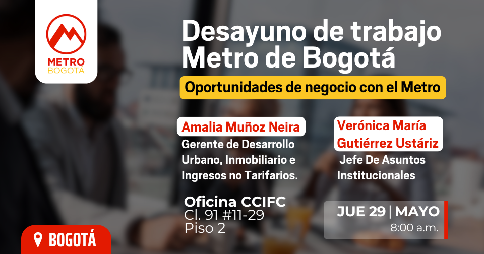 La CCI France-Colombia los invita a participar al desayuno de trabajo con representantes del Metro de Bogotá, el cual tiene como propósito dialogar sobre las oportunidades de oferta de valor que ofrece el proyecto Metro para nuestra comunidad de negocios.