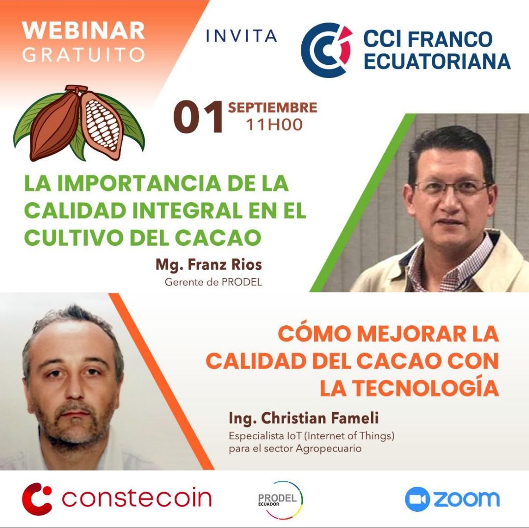 la Cámara de Comercio e Industrias Franco Ecuatoriana, con el apoyo de CONSTECION Cia. Ltda y PRODEL, les invita a participar de este interesante webinar sobre cómo mejorar la calidad del cacao durante el proceso de post-cosecha.