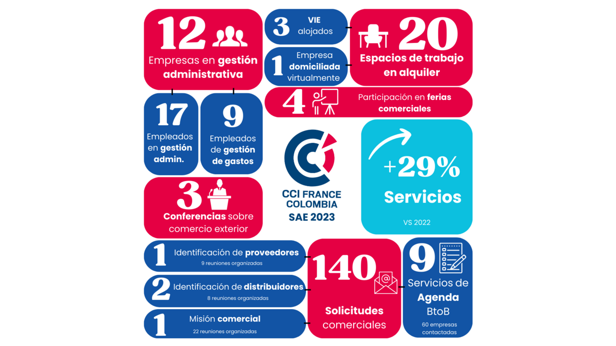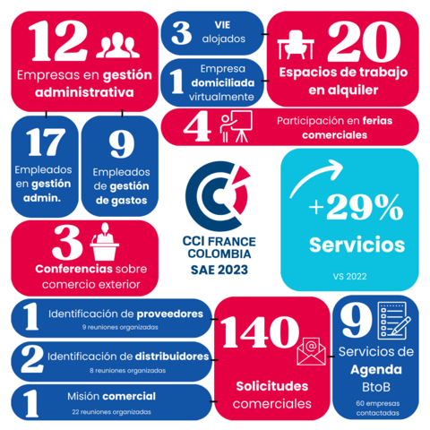 El Departamento de Servicio Apoyo a las Empresas (SAE), dirigido por su gerente Nicolás Velásquez Díaz y su coordinadora Yasmine Azlabi, se encarga dentro de la CCI Francia-Colombia de asesorar y apoyar a las empresas francesas que desean instalarse y expandirse en Colombia.