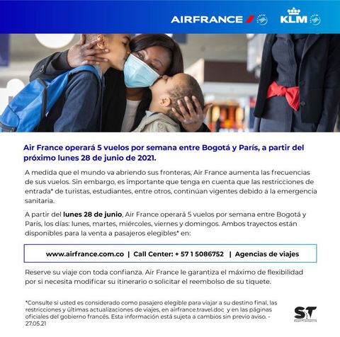 A partir del lunes 28 de junio, Air France operará 5 vuelos por semana entre Bogotá y París, los días: lunes, martes, miércoles, viernes y domingos. Ambos trayectos están disponibles para la venta a pasajeros elegibles* en: