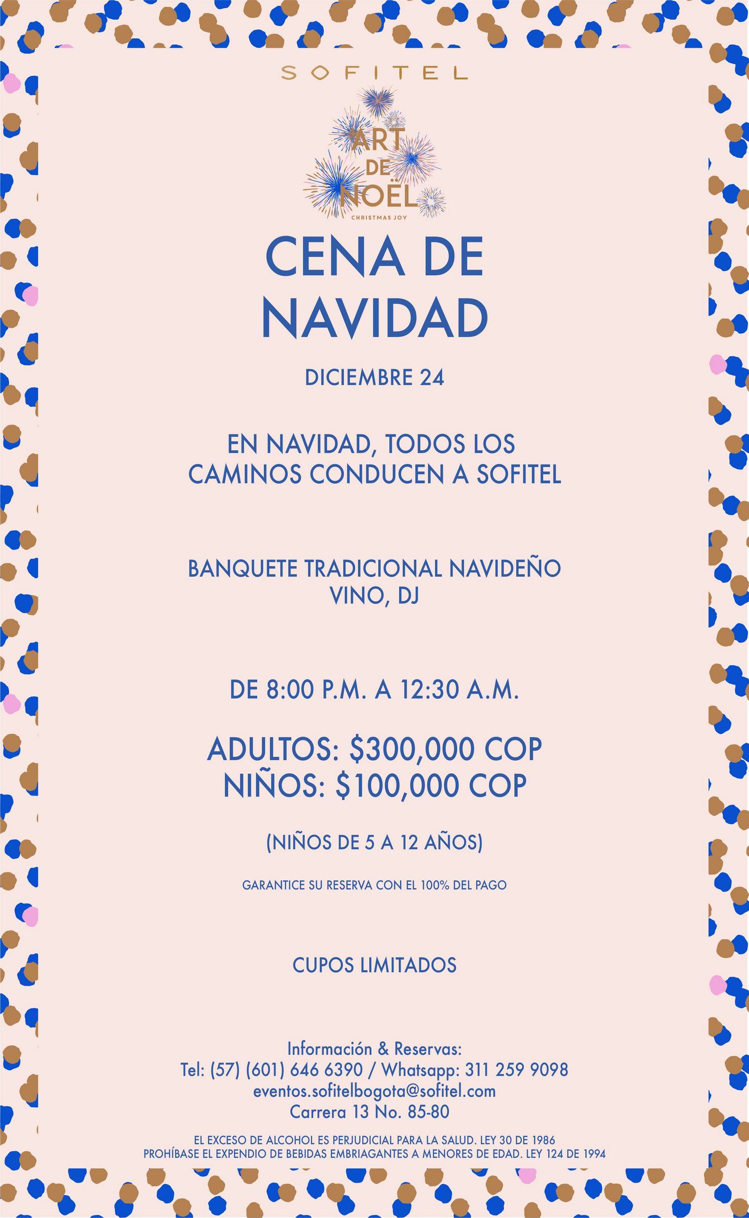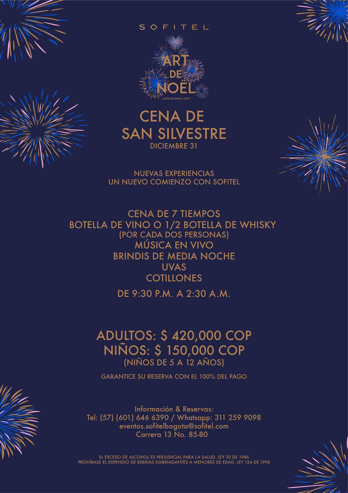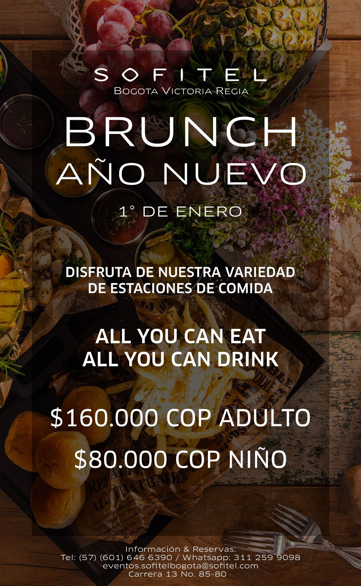 Noticias de empresas Celebra Navidad y fin de año en Sofitel Bogotá Victoria Regia 12 diciembre 2022 Disfruta del banquete tradicional navideño, cena de 7 tiempos para San Silvestre y variedad de estaciones de comida en el brunch de año nuevo. Información & Reservas : WhatsApp : 311-2599098eventos.sofitelbogota(@)sofitel.com